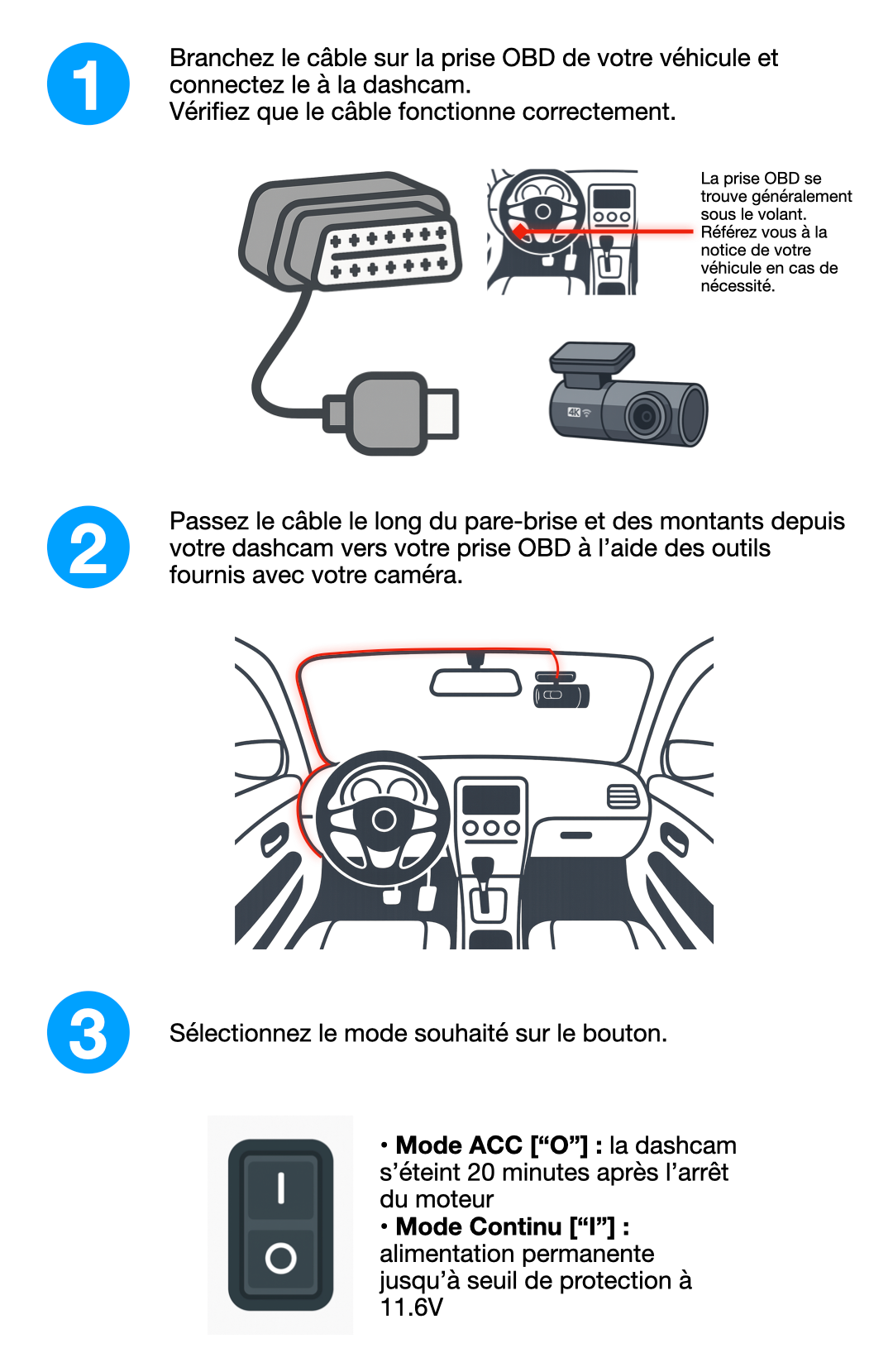 Le câble OBD CAMRoute vous permet de connecter votre dashcam directement sur la prise diagnostic de votre véhicule. Simple à installer, il fournit une alimentation stable pour une surveillance 24h/24, avec protection intelligente de la batterie intégrée.